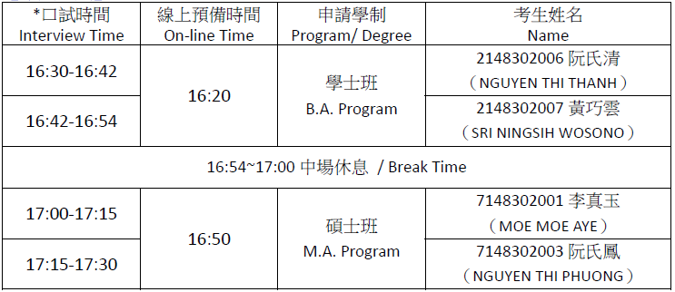 2. 為確認考生身分,視訊口試時請備妥護照或身分證件。