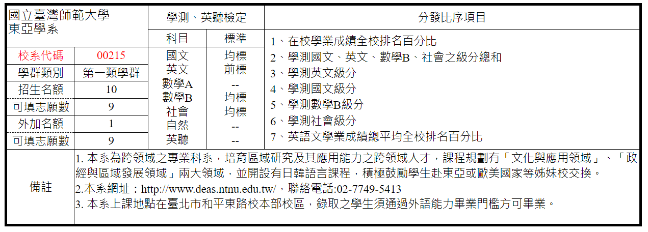 112學年度台師大東亞學系繁星推薦入學資訊